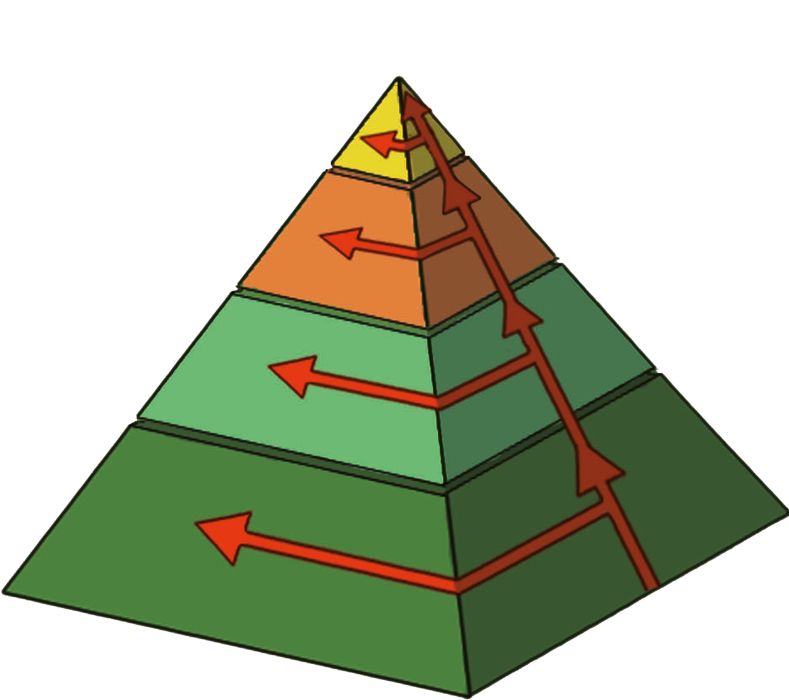 Pirámide de enerxía. Representa a enerxía que existe en cada nivel trófico e a que se transfire aos niveis superiores.